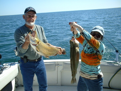 The last three days of wind has kept the temperature break and currents on the move. Correct boat speed and presentation has been the answer to catching fish. Key in on 50 degree temperature for success. Surface temperature is 70 with the Temperature break moving each day. Trolling west to east will cover a large spread of temperatures and currents. When you mark fish on the locator without success change direction and see if that helps. Currently the action down is at 25 to 120 feet. We are catching mostly Chinook and Big Brown Trout to 14 pounds. The photo with this report is of two big Browns. The fish are in 45 to 120 feet of water. The best action is over 100 feet east of the Filtration Plant and north for 2 and 3 year old Chinook. Four year old Chins are in the warm water and the rain the next two days should bring some of them up the Milwaukee River. Look for them outside the harbor and out to 65 feet of water. Church Walleye planer boards with 8 and 10 color Cortland Kerplunk leadcore and 300 feet of copper wire are taking Chinooks. For all species on sunny days use Reaper Magnum Monkey Puke, Peacock, Fish n Chip and Big Joe Silver spoons. Use all glow spoons early in the morning and inside the harbor. On overcast days and low light try the Reaper Magnum Blue Fox Glow spoons. We are getting good reports of action in the warm water conditions on both sides of Lake Michigan on these glow spoons. This makes sense as most of the fish are coming deep and the glow spoons are most visible for the fish in deep water presentations. For anglers that have not tried the Reaper and Vulcan spoons from Badger Tackle.com I recommend you give them a try. They are offering a buy 4 and get 1 free at this time. The fish ranged in size from 3 to 21 pounds. Trolling at 1.8 to 2.0 miles per hour at the ball will get more fish. Experiment with speed up to 2.6 MPH. Lately a faster speed has worked for the big Chins. The only place you will find Reaper and Vulcan spoons is on the Badger Tackle web site at http://www.badgertackle.com Jim charters out of Milwaukee, WI. With Blue Max Charters He can be reached at 414-828-1094 or visit his web site at http://www.bluemaxcharters.com I am always available for a comment or update. Thanks!!