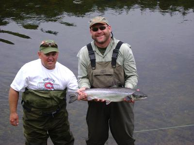 Now on too some reports of fish being landed! The last couple days things were starting to slow a bit but we were still hooking a few. I had Doug Underhill's Daughter Carrie Underhill and her boy friend Adrien from South Africa out fishing Tuesday. We saw several fish in the morning but only rolled one fish. That evening we started around 5:00PM and we fished the Vickers Bar and saw some fish but they would not take. Above us Joel Kitchen and Rick Trenholm was fishing and they just finished landing there third on one of my brown bombers. They yelled out for us to come up and give that pool a try. I was not long pulling the anchor to get Carrie and Adrien into some fish. We got in the spot Joel was anchored and put the brown bombers to work, we were not long raising some fish! Carrie raised a salmon and did not set the hook fast enough, I yelled pull and she did but as Carrie was not familiar with dry fly fishing for a few years she only pulled on the line and had not pulled the rod up too set the hook. She raised about six fish before she figured out to pull the rod back and set the hook! She then hooked into a salmon about 10 pounds. She played the fish for about 5 minutes and as it got close to the boat the hook pulled out. I lost a salmon after one jump on a killer whisker bomber just after Carrie. Adrien lost a salmon after two jumps on a brown bomber using my 15 foot Loop Spey rod.