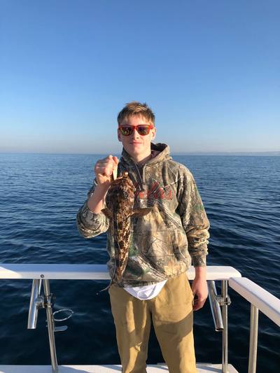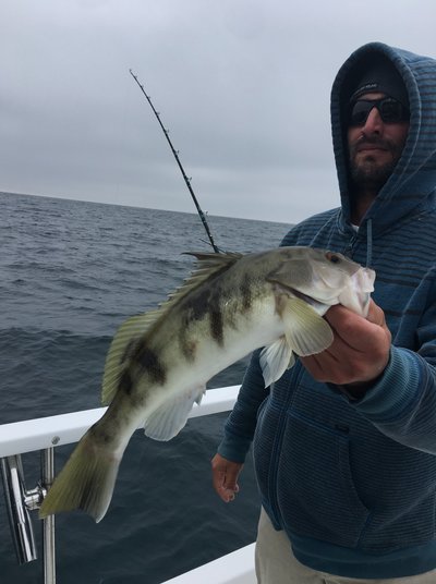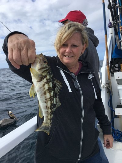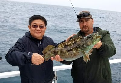 Captain Brian at the helm and first mate Mat on a 3/4-day local charter today. The Banana Brothers pull it off again catching a lot of fish (contrary to popular superstition about bananas bringing bad luck to fishing). They caught 1 halibut, 8 lingcod, 5 rockfish, 1 calico bass, and 1 whitefish (all released). They kept 1 halibut, 2 sand bass and 2 sculpin.