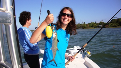 We made the short run to Pinellas Point and got right into the action in 4-6' of water. Trout, Mackerel, Ladyfish, Catfish and Pinfish eagerly attacked our shrimp. Maddie's rod bent and it was clear she had something different on. Moments later a Black tip shark was boat side. I was I had audio of the girls screaming as I brought the little guy onboard.
