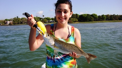 Thursday morning I had the pleasure of welcoming 4 rookie anglers Russ, Betsy daughter Maddie and her friend Nicole. We ran to the grass flats off Tarpon Key looking to get on the spotted sea trout action. We quickly deployed four rods with floats and live shrimp only have nothing happen. This spot has been a consistent producer so I was surprised we did not score. I bumped us forward 100' re set the lines and bam 4 fish on at one time! Feisty trout were inhaling our shrimp with abandon.