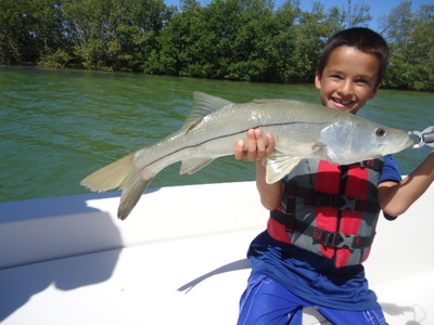 The snook bite has been steady along the passes. Its great to see the snook population rebounding after the freeze several years ago. Jake quickly got in the action with a very nice snook that jumped numerous times and ran all around the boat. After several minutes he was proudly posing with his first snook. Not 5 minutes later we had a big snook explode on a bait only to come unhooked quickly. As luck would have it minutes later Jet got into a beautiful fish. The snook exploded several times and make numerous runs towards the mangroves. With Dad helping the upper 30" snook was now boat side. As I tried to boca the snook the frayed line gave way!
