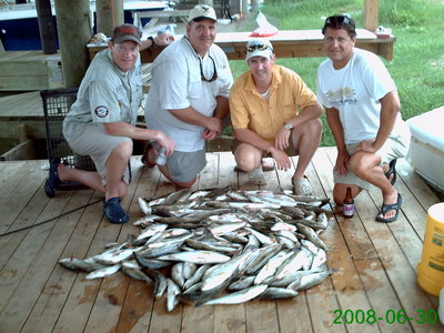 Monday, good day for fishermen, bad day for Trout on the Beach. My friend Brian Renshaw brought Allen, Cliff, and Chris along for the maiden voyage on the new Blazer Bay. We made a stop by Campo's for bait and headed to Bay Eloi. From the first cast it was fish on and the action never stopped. The Trout were eating up the live shrimp under a cork, and I joined in on the action with a Top Dog. The Trout were nothing big, but fast and the best eating size, 13"-16". It did not take long to fill our limits. It was fast and fun. We did make a stop to look for some Reds, but the there was a good rain storm heading our way so we bailed out and head in to beat the rain and the heat. 125 Trout and a great time by all.