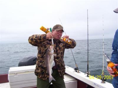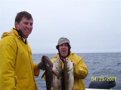 We hit the cod after trying a few spots early. And when we hit them, we hit them hard. We had all 4 customers on at once several times and there were a good deal of keepers on many of our drifts. We fished the morning in one spot on the western edge of Stellwagen Bank, and then we moved away from the crowds and really did well. We didn't catch anything too large, but the fish really jumped on the line. Once again, it was all jigging, and mostly jigging with the light tackle. Of course, now we're one rod short....I gave the casting demonstration to end all demonstrations....with my rod flying out of my hand in into the wtaer, never to be seen again!!! That was embarrassing.