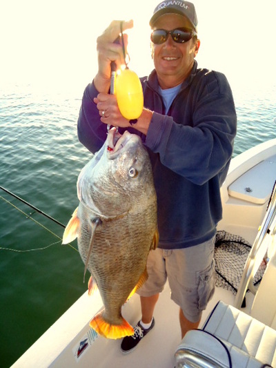 Gulp Shrimp 4"on 1/2oz Mission jig heads is the ticket for the Drum. We got hit every cast into the school, just let it sit on the bottom and hammer the hook home when the drum picks it up. My angler Dave took 20 minutes to get these beasts to the boat, while they don't make long run these Drum are liking being hooked to a tank. While putting back a 50 pound Drum I almost fell over as the Drum made a dive towards the bottom with me holding the Boca grip.