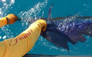 Wednesday (12/13) was day two with Marty, Becky, and Ruth. The competitive spirit of Becky and Ruth kicked in while bait fishing and the challenge was on to see who could catch the most 6 baggers of herring. Needless to say, the livewell filled up quickly and out we went. We made two drifts to see if the tarpon would cooperate during the day. No luck there, so we worked our way offshore. We still had north current, however, it was not as strong as yesterday. The wind was E @ 11 - 16 knots, so toward the latter part of the day, the seas were calming down. The downrigger scored first with a kingfish. The next drift, we missed a fish on the downrigger. Before setting up the third drift, we ran back south. The kite saw all the action for the remainder of the day. First it was a double header of sailfish in 110 feet. Becky and Ruth both enjoyed pulling on their fish and got to see some great aerial action courtesy of their fish. At one point, one sail jumped over the line of the second fish and we had to do some quick scrambling over and under to keep the fish separated. After releasing the fish, the girls went back to catching some sun while Marty and I tended the kite baits. It didn't take long before Marty got to witness a kingfish sky rocket the short kite bait 3 times before chopping it in half on the 4th try. We quickly changed baits and as soon as we got them back out, the long bait took off and we added another kingfish to the box. We reset the baits again and this time, another kingfish sky rocketed the short bait 3 times before the sail came up on the bait. The line pulled down and them the long bait got hit. Marty reeled on the long bait while I pulled the kite in as the wind was dying off quickly. By now, both girls were up and taking pictures. I reeled in the short kite line and when it came tight, there was fish on it. Ruth took over and caught another kingfish that was added to the box. Meanwhile, Marty's sailfish took him from the bow to the stern and across to the windward side of the boat where we landed and released the fish. With a 3 for 3 sailfish day and 3 kingfish, we headed in as both ladies were feeling the effects of the seas.
