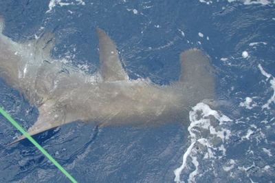After a good 35 min of back and forth tug a war up popped this 350-pound Great Hammer Head Shark.