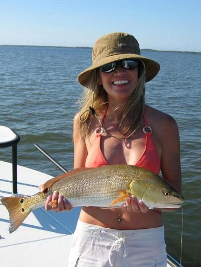 The fishing on Mosquito Lagoon's north end this week has been red-hot! Large schools of redfish are starting to show up even with the extremely High water. Here is a photo of Sandra from Kansas City with her first ever redfish!