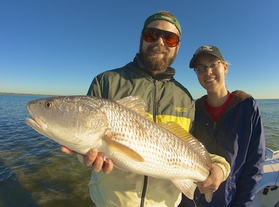 -Tuesday- Happy Birthday Joey Cordell! Dad Carey took Joey and his girlfriend Kelly out for a day's Mosquito Lagoon fishing. It was good. We found quite a large school of reds at the top of the slot. Kelly and Joey each got one on mullet chunks. That was the last of the bait use, though.