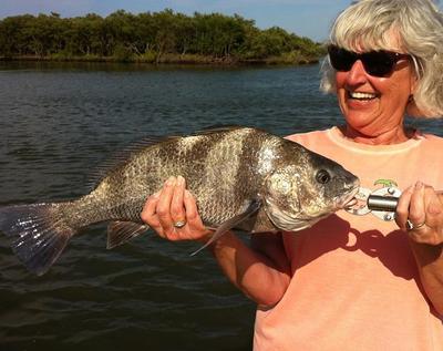 On a recent afternoon backcountry mixed bag trip, a group of first time clients from Pennsylvania had a great fun time, catching Trout, Mangrove Snapper, Jack Crevalle, Ladyfish, and their favorite catches were a few good Black Drum including this nice one caught by Bobbi.................