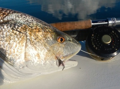 I strung up that fangled fly-pole thang, tied on a grizzly seaducer. The fly hit the water and a fish nailed it, first cast.