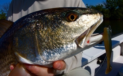 Mike got the first red on a DOA CAL shad tail. The fish was almost under the bow of the boat when Mike stuck him. I haven't had one bite so close to the boat in years. It was quite extraordinary. It wasn't a big one, 20 inches or so, but it was a redfish and I was darned glad to see it come aboard. It posed for a photo and was released.