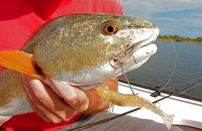The second place we looked, which had been full of fish a week earlier, had only one as far as we could tell. Maxx spotted it and dropped a DOA Shrimp (clear with gold glitter) right in its face. The fish obliged, unfortunately for him. One mission accomplished.