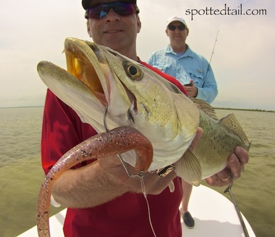 On Sunday Rick Schooler and his friend Dave joined me for a full day's fishing on Mosquito Lagoon. Rick was throwing a 5.5 inch DOA CAL jerkbait, new penny color. Dave was tossing the DOA CAL airhead, red with gold glitter. Fishing was not particularly hot, but after Rick got his third fish Dave wanted what Rick had. Oh my God, I only have two left!