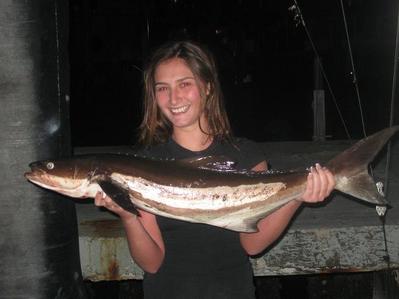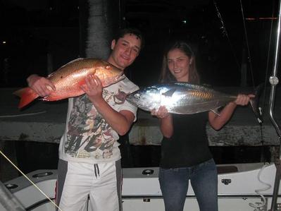 There's been a lot of activity offshore this week in Fort Lauderdale. This afternoon, Joe and his girlfriend got in on some action aboard the Frequent Flyer II. Around 4 PM we headed out the Intracoastal Waterway, not like the usual 8-12 or 1-5 trips we run daily. We rigged up some fresh bonito strips and started off trolling. The King Mackerel and Bonito were showing themselves in good numbers. When we reached the reef, the sun started to set and man was it pretty. We crossed our fingers for a grouper or snapper to bite. Within 10 minutes of trolling the reef, we were hooked. We saw color as the fish hovered below. The 7 lb Mutton Snapper was bright and beautiful. We knew we were in a good spot now, so trolling gear went right back in the water and we sat back for another instant bite. After 15 minutes in the fighting chair, Joe reeled in a beefy, 20 lb Cobia.
