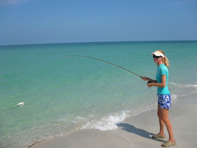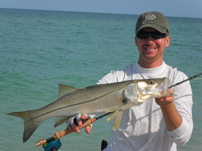 The Snook on the beach are there in good numbers. I scouted a spot I hadnt fished in a long time and saw probably a hundred this morning, but it was a little tough feeding them. I wound up with 4 including a pretty nice one. Caught them all on a 5 weight flyrod which made it a blast. There was a small swell but the water was clear, so remember to be as stealthy as possible, use a small, natural looking fly (or lure), and scale down to a short piece of fluorocarbon leader. The fish can become very active early and late or immediately after rain (or especially a thunderstorm), so try to focus on fishing these times.