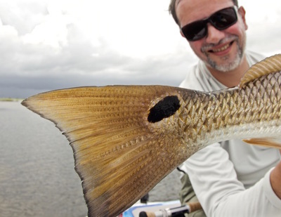 Tuesday found Alexandre Pinto, a fly fisher from Sao Paulo, in the Spotted Tail. He wanted to add redfish to his life list. Based on the forecast I thought it would be a tough day. On the Indian River Lagoon, we had clouds and wind, and high, dirty water, not a good combination for finding redfish you can see and cast to. First spot- nothing. Second spot- nothing. Next spot- a few spooky fish and zero shots. Next spot, a few spooky fish and zero shots. Now desperate, I just picked a piece of shoreline at random and started poling along, watching the clouds get ever higher, wondering when the lightning would start...