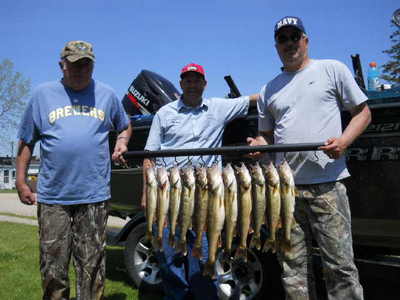 As I sit and write this quick report, the wind that I wanted earlier today has finally started blowing. Today's trip was with long time client Dale DeWildt and his son Mark. We left the resort around 6 a.m. and I had hoped that the wind would start blowing like it did yesterday to get the fish active. Unfortunately for pretty much all of today's trip it was pretty calm. We still caught fish, it just wasn't fast and furious like yesterday's bite. In fact, we didn't get most of our nicer fish until the last hour of the trip when the water temp. got up over 60 degrees and lots of boat traffic left. We were trolling Walleyes Choice harnesses behind bottom bouncers for most of the day. I-86, I-42, I-68, and a firetiger J&K Tackle in-line harness took most of the hits today. We ended up with 11 nice walleyes and lost 6 others that come off on the way to the net. We've got another half day trip tomorrow and after we do some walleye fishing in the early morning we're going to try for some perch before they have to head home around noon time. Good luck from all of us in the Bay de Noc area.