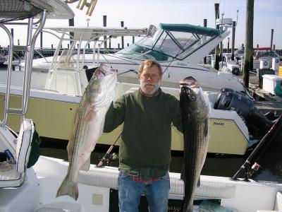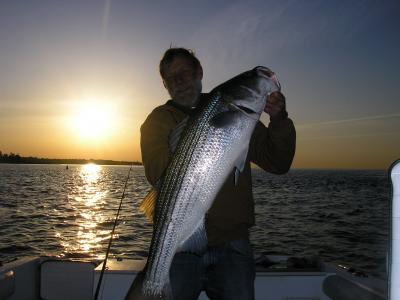 I was able to get out this morning with ChuckA, We met at my boat at 4am and took a ride out to the harbor. It was slack tide so getting bunker was alittle rough. I had some from the night before so we used that. The action was slow to start but once the tide got moving the bite was on. Chuck hit the first keeper of his life. It was just over 30 inches. But to me that wasnt big enough. about 20 mins later he had another run, set the hook and all I heard was line ripping off the reel. Chuck said with a big smile on his face "This is a good fish" . It was a good fish. 40 inches 26-27 lbs. A nice fat fish. We kept at it landing some blues and short stripers and Then some bigger bass move thru. At one point 3 rods were hooked up. 1 with a blue, one with a 36 inch fat striper and mine with a 38 inch fat striper. We decided to call it quits but before we went in Chuck want to see how to set agill net. So I went step by step with him on how to set a net with the tide and pull and empty it.