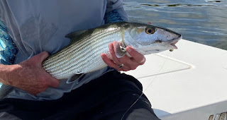 Happy New Year everyone! After taking the 1st off I was back to work with long time client Bob and Anna. We met up at the dock and headed on looking for bonefish where once again they proved to be elusive on fly and spin but we did miss to hook ups on fly. Dang it! We moved off to look for live bait (pilchards) but no success. Well, we hit a few spots to bend the rod and all the fish were small but at least we got something in the boat. Towards the end of the trip and the outgoing tide we fished for bonefish one more time and boy did we work. Bob later confessed he said to himself "O.K. last cast." when his shrimp got whacked, the rod got a deep bend and the drag smoked. Finally, a bonefish! It was solid 9lber to end the day. Whew, that was close!
