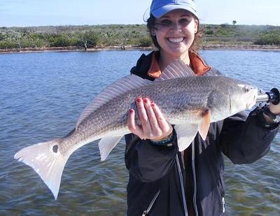 Winter 2013 has so far been mostly mild to warm with a few chilly days mixed in here on Mosquito Lagoon in East Central Florida. Water temps have ranged from mid to upper 50's to the mid 60's F, in some ways more of an early spring fishing pattern during the warmer days. Many of the Redfish schools holding a smaller number of fish than would be the case during a cold winter, which would have a smaller number of very large schools roaming the flats here in the North Lagoon near Oak Hill. Mild winter baits we are using are live shrimp, live finger mullet, cut mullet, Gulp shrimp, and shad tail jigs. On some days with light breezes, Redfish have been tailing in the shallow grass making for great sight fishing targets, use a soft landing bait placed just beyond your target and skim the shrimp or bait of choice along the surface allowing it to quietly settle next to the fish which is rooting for food in the grass. Here is young Katlin with her biggest Red as she out fished her dad and uncle on a fun trip which they caught 5 Reds and several Seatrout early in January.