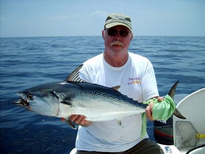 Once arriving at the spot we set out three lines two up & one down only to have all three lines get hit at once. The fire drill was on with a hefty sized Bonito along with a sky rocketing Barracuda at very short intervals.Shortly after releasing the Barracuda & Bonito a Dolphin leaped in to action! After a short fight, the dolphin decided he had another dinner engagement and decided to spit the hook!