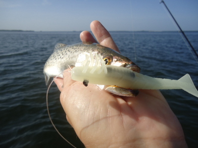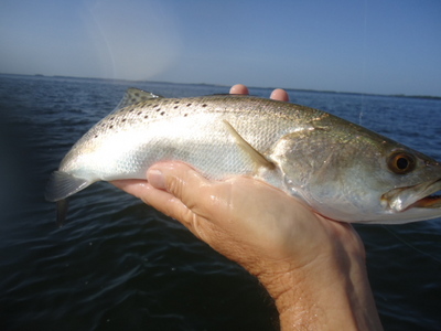 Sticking to deeper grass flats the action was fast and furious. Bait after bait was attacked by small trout and ladyfish. It was common to have several fish following the hooked fish to the boat. The Ladyfish were large and made lots of twisting jumps. Switching to DOA's Deadly Combo worked just as well and did not require rebating.