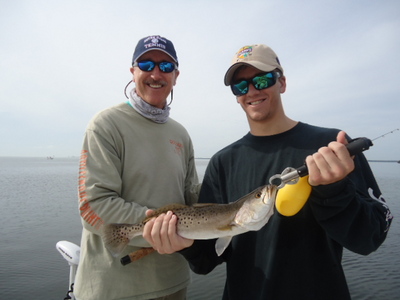 My anglers Dave and Son TJ wanted to start the day playing with giant drum. I spent 45 minutes up in the Pathfinders Tower and never saw anything. No problem we will go catch big trout as I have been doing over and over again. Well an hour later we had 1 20" trout to show for all our work. I moved deeper and as planned rapid action on small 12-14" Sea Trout.