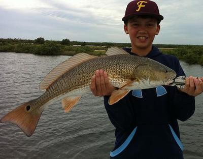 Having a fun fall of fishing here on Mosquito Lagoon Florida in November 2013, Redfish and Seatrout catching in the autumn pattern with high water, clear on the grass flats, still a little cloudy in some backcountry areas with a mud bottom. Water temperatures in the middle to upper 60's, cooling off a little but not yet winter chilly. A few small schools of reds starting to form, but still plenty of single fish. Shoreline areas are still a good bet with the high water, but as of a few days ago noticing slightly lowering water level out on the open lagoon area again making more grass flats a favorable depth of 12" to 20" which is "Redfish depth" in my neighborhood. Still baiting with mullet mostly, throwing topwater lures and weedless jerkbaits in the early morning low light conditions. A recent charter trip with 3 generations from Indiana, grandpa Ken treated son Joe and grandson Danny to fishing with me. All caught some Reds along with Trout, of course young Danny caught the largest Redfish........