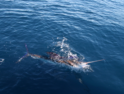 You also need to have wind to fly a kite and we have had many days when the wind was extremely light. When the wind is light we use a helium balloon attached to the kite to keep the kite up and the baits dangling on the surface. We have resorted to this technique quite a few times in the last few weeks and have had great success as well. Even with the helium balloon, you still need to have just a little bit of wind or the balloon and kite will go straight up over the boat or there is just not enough wind to even raise the whole kite, lines clips and baits. We had those conditions today and had guys on board that wanted to catch sailfish, so we resorted to another technique based on conditions again. This time we would run up and down the edge and look for free-jumping sailfish. Once we spotted a free-jumper we would get in line with it and fire out baits on spinning rods. This worked well for us today. Our first free-jumper we hooked a triple header of off him and caught all three. Our second free-jumper produced another triple but two lines broke off because they got tip wrapped and the third fish pulled off. The wind then picked up ever so slightly where we put out the helium balloon and kite and at the end of the day we caught another sailfish so we ended up 4 for 7 and half a dozen mahis. A very good day especially when the conditions were less than ideal.