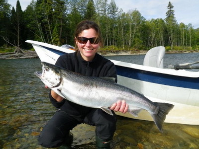 Steelhead should no longer be targeted. The record 85-pound (if my memory is correct) Chinook was landed by Gordy McDonald of Terrace, BC. It was landed in circa May 1985. Caution: Jet boaters please be careful because there are new channels and lots of trees have fallen into the river. How to: Try using spoons the next time out. Some of the best spoons are made by Gibbs. Some of the best rods are GLoomis. Shimano makes excellent spin reels. Tuf-line makes excellent braided line. Duracast line is coated and slides effortlessly through the guides and won't wrap on the tip. Tip: If the Chinook are in a pool you should see them rolling. Try casting spoons. They love spoons and by using Tuf-line you have a better chance of landing them.