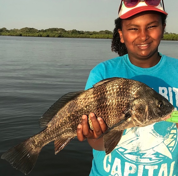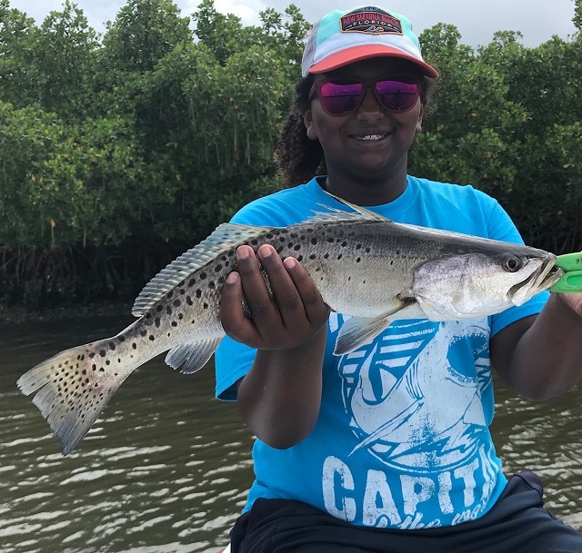 Fall 2021 is knocking at the door here in East Central Florida, the mullet bait fish run has started, schools of swimming bait will be moving south down the coast along the beach and some of these schools will be coming down the intracoastal waterway into my backcountry area at New Smyrna Beach and Mosquito Lagoon. Inshore game fish will be on swimming south also, eating the mullet as they go, schools of fun surface game fish like Jack Crevalle, Bluefish and Ladyfish hit the mullet on top, making for easy to see surface activity to cast lure or bait into for a fast hookup and drag pull. These fish are migrating south down the coast in fall after summering up north, they will winter in south Florida. Our resident fish which are here year round will be feeding on mullet and shrimp also, Snook, Seatrout, Black Drum, Whiting, Redfish, just some of the other usual catches in the Mosquito Lagoon backcountry. Eva from Tennessee caught a nice Black Drum out on a recent trip along with other fish of varying species…………..
