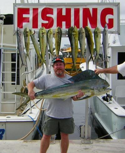 On the 11th we were joined by Ryan, Matt and Han's all from California and all top sales men for Best Buy, these guys won a trip to Florida and a trip on a cruse ship. Nice Guys!! They decided to do some sportfishing while they were here and had their minds set on going off shore and trying to catch some dolphin so they could have a fish fry for dinner. So off we went further and further off shore. We did manage to catch a few nice dolphin but we never did find the mother load we were looking for. As the day went on I looked down at my GPS and I noticed that we had trolled all the way out to where we go at night when we go when we are sword fishing. I had heard that some guys were trying to catch sword fish in the day time and we had a couple of big frozen squid aboard so we all talked about trying this. Well this was going to be strictly experimental this was not something we were used to doing and the bottom of the ocean was just over 1,800 feet down. So we figured out a plan and this would definitely be a team effort. We figured that it would take forever to reel this back up. It took us over 10 min to get our bait to the bottom we did not want to drop it to fast worried that our bait would get all tangled up. It also took a little tricky boat handling because we had about 3 knots of current to the north at the same time we had about a 10 miles an hour wind out of the southeast. After a few min of motoring the boat around I found the right way to hold the boat to keep our line straight up and down. After I master the art of holding the boat in these conditions I decided to pop up a kite with a couple of live baits to one side and a another live bait straight out the back of the boat. Things were looking pretty good and we figured we had a good shot at catching some dolphin with these perfect live baits way out here. Well we had been fishing with all these baits out for about 20 min when Glen (the mate) noticed that our deep line had gone slack. At this point I was not sure if the weight had just laid on the bottom or if we actually had one on that was swimming up. So we decided to treat it as though it was a fish. So I told glen to start reeling as fast as he could and as soon as his arm was starting to let up the next gut was to start reeling and the same went for and so on. Well about 10 min into this reeling like crazy they thought that they could feel some weight but we still were not sure whether or not we were connected, After 10 more min of what we thought was the weight the line started screaming off the reel and now there was no doubt we did it we were connected and we felt pretty confident that this was the fish we were after.