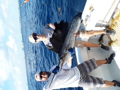 We decided to change things up and went into kite fishing. We put a kite up in the air with a couple of live baits and a bait down on the bottom. All of a sudden, I saw a black shadow underneath the live bait, and it was Sailfish. Jacob was our angler, and he started fighting the Sailfish. The Sailfish jumped out of the water, making big runs and came back up jumping again. After a great fight, we got the Sailfish up to the boat, removed the hooks, got a photo and released the Sailfish. We went back to trolling and picked up another few Bonitas.