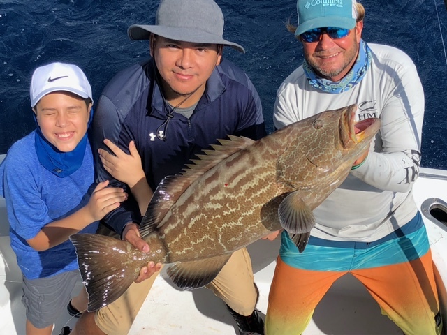 Once the anglers had enough for dinner, we brought in the lines and started setting up for wreck fishing. The first mate got a live bait rig with a circle hook and sewed up a live Blue Runner. I positioned the boat up current of the wreck and dropped the live bait down to the sunken shipwreck. It didn’t take long before the rod bent over and drag started ripping out. I had a junior angler, and he did a great job fighting this fish. After a good battle, he brought up a really nice Black Grouper. Since they are in season, the first mate gaffed the Grouper and welcomed him aboard.