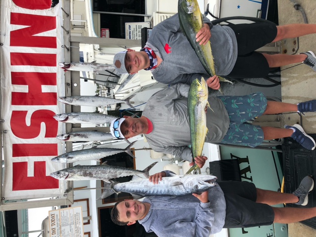 Our next stop was to head towards a wreck, so the guys cleared the trolling spread, and we got a live bait rig with a down rigger ball ready to send down towards the sunken ship. We positioned the boat to be up current of the wreck and set out a few live baits. It didn’t take long until a large Barracuda came crashing down, and we had fish on. The angler grabbed the rod and successfully fought and brought in the Cuda. We put the trolling gear back in the water, and I fished close to the drop off in 100 feet hoping to find a few more King Mackerel, and we did. The deep planner lines went off and we started catching Kings; the anglers did a great job fighting the fish.