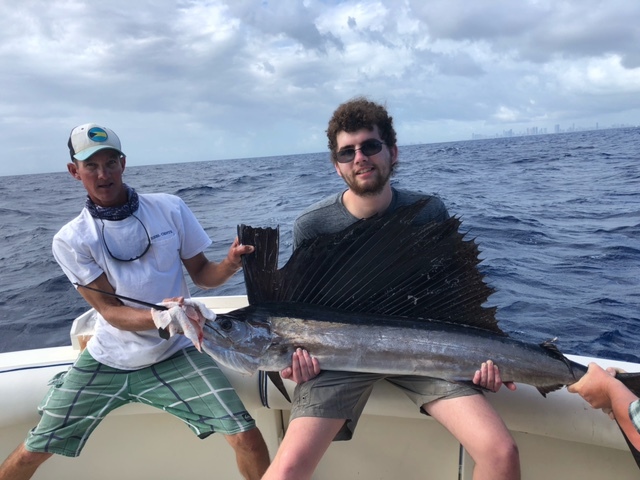 I wanted to get out to deeper water and try for Mahi Mahi. When fishing out of Fort Lauderdale, I will continue heading off in search of some fish looking for a weed line, floating debris, or birds. Once I got out to 750 ft. of water, I started seeing plenty of flying fish and birds in the area. Suddenly, the rigger line came down and we had a Mahi on. Sofia was my angler, and she did a superb job. We ended up catching a total of 5 Mahi Mahi’s, and a few were undersized, which we released. I started heading up to the north fishing a broken weed line. All of a sudden, the long rigger line came crashing down and up came jumping a full grown 7-foot Sailfish. Jackson was my angler; he put on the fighting belt and fought the Sail. The Sailfish put on an awesome show, jumping out of the water at least a dozen times. After an exciting battle, the Sailfish was up and alongside the boat; the first mate reached down and pulled the fish in the boat. We removed the hook, and after a quick photo, the Sailfish was back in the water and swam away very healthy.