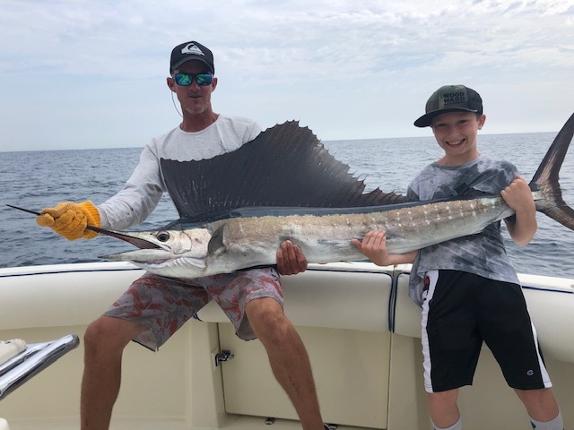I could see an oil slick offshore from where the Tunas were biting, and I trolled the baits into the spread. As soon as they hit the slick, the right long rigger bait came crashing down, and we hooked a Sailfish. Garrett was the angler, and he did a great job fighting the Sailfish. After a 20-minute fight, he had the Sailfish alongside the boat. The first mate brought the Sailfish into the boat to remove the hook, took a quick picture and successfully released the Sailfish to swim away.