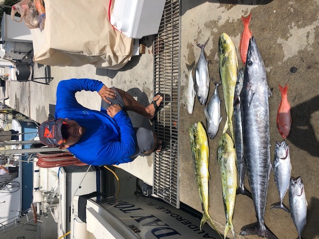 I worked the drop offs and headed over sunken wreck structures. We got a nice strike on the planner line, and the angler brought in a Tuna. Then on the outrigger, we caught another two nice fish. The Tuna bite was better the day before, so we decided to change tactics and head offshore in search of Mahi Mahi. We got out about 6 miles offshore and found a nice weed line with a few birds diving. As soon as we made the turn on top of the birds, the rigger line came down, and we had a Mahi Mahi on the line. The first mate had a Ballyhoo on a spinner and casted it out quickly, coming tight on another fish.