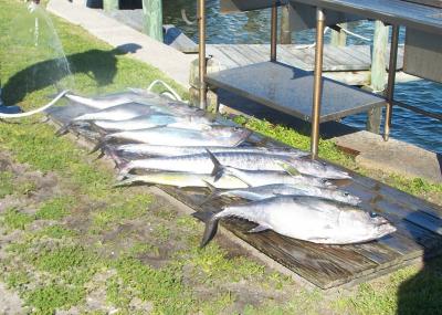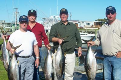 Finally a small window of opportunity. Headed out with a great crew from Kinston and Scott Crocker as the mate. Started fishing at the 530 line and fished up to the Rock. It was a little rough 5-7 feet and it never laid down even though thw weather man said it was. Shortly after putting the lines out we picked up 2 wahoo on top. One was nice and the other small. Then about 9:30am the tuna bite was on till about noon. We picked up a total of 7 with a couple small and the rest very nice. We had one black fin at 20+ We also caught one small dolphin. The water looked clear and it was 77 degress on the rock. Man it was nice to finally see some tuna. Friday looks good before the blow Saturday but I'll be on th hill unfortunately. Scott did a great job and he was coverd with blood from head to toe.