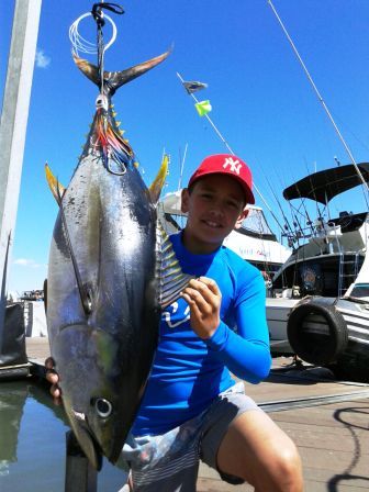 Easter weekend brought us a cold front and some strong SW winds and so we were only able to do one of our trips. Inshore waters are now at 22 deg.C and deeper out just over 23 deg.C so the temperature is steadily dropping as we get into Autumn. There was a strong S-N current but heading out in the deeper water we managed this magnificent Yellowfin Tuna making an 11yr old young man very happy.