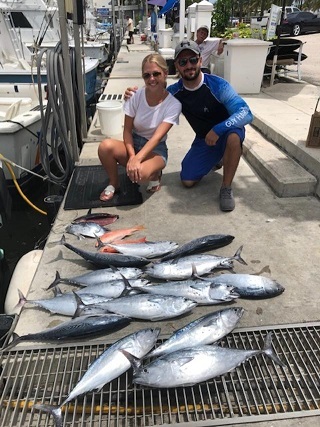 Joe and Alexia chartered the Top Shot Sportfishing charter boat team for a private deep-sea charter boat sport fishing trip in Fort Lauderdale, FL. The anglers had a great day on the water and fun catching Bonitas with the Top Shot Sportfishing Charter Boat Team, Captain Zsak, and mate, Dave. We started the morning around 7:20 am and left the marina heading out of Port Everglades inlet with flat, calm seas and a little breeze.