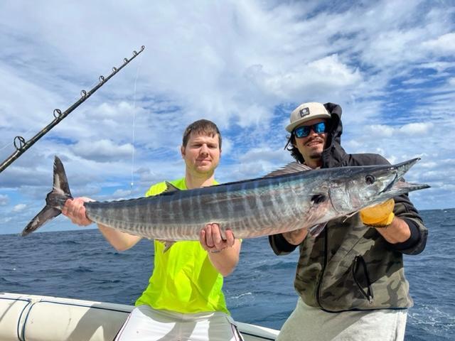 We had nice conditions with an easterly wind blowing 15 mph out of the east with a couple of feet of chop. Easterly winds are generally good wind direction for all fishing conditions. The Mahi Mahi get pushed in closer to the shoreline. East winds allow us to kite fish, as well as pushes the pelagic species up along the drop off, which is where we spend a lot of time trolling and live baiting.