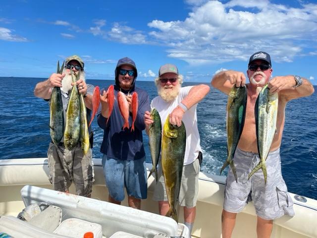 We have been catching some Vermillion Snappers - the bite has been a little better in the morning. So before heading offshore and targeting Mahi-Mahi, I decided to go to one of our local wrecks and bottom fish for snappers. The first mate had some fresh Bonita, which makes great Snapper bait; he cut them up into bit size cubes and rigged up what we call a chicken rig, which is a 4-hook rig in line connected to a weight. As soon as we were on top of the spot, the guys started sending down the rigs, and as soon as the baits got to the bottom, we started getting some Snapper bites. This is great action especially when the fish are biting good - we were hauling over the side both legal and under size Snappers. The legal size is 12”, and we released any of the Snappers that were undersized.