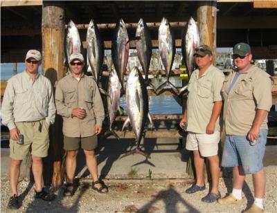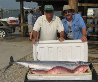 For the rest of you with some time read on; it was a pretty interesting week which began and ended with a little drama..everyone made it back to Venice from the shipyard in the nick of time to make thier trips..some cutting it closer than others..I guess the report starts well before the fishing and trying to make a long story short and interesting will be a real challenge..the first part of this report goes out to anyone who has spent time in a shipyard either doing the work themselves or waiting on others to do it..Hunter had significant fiberglass work done to the twin vee and I had both heads and injector sets replaced..aftercooler and heat exchanger tube bundles cleaned..everythign tuned, props and shafts checked, bearings replaced and bottom touched up..finally found the source of the ever nagging vibration and nipped it too..too long a story to tell but suffice it to say we didnt have a good fit in one of the couplings..when we left Seabrooke at Midnight on Wednesday she ran vibration free and turned up all the way clipping along at 30 knots on top..anyway we had to leave late from New Orleans and decided to have two captains share the load..got cleaned up after the test run and departed at 12am Thursday for our Thursday morning charter..Capt Lance and I made it with 2 hours to spare for our charter..Scott L had gone down the night before with our gear, food and clothes..everyone met at the dock to load gear at 5..trip went great..I had Ken Lutgsh et al Scott Leger had the Savant transportation crew; Hunter arrived at the marina later that day from the yard..Fishing and weather was great Thursday and were both in the fish all day..it was great..calmand warm and lots of action too..most fish came on the topwater poppers..when the dust settled we each had 8 and 9 yellowfins 30-60 pounds respectively..it was nice having both Lance Walker and Little Jon to help with the sleeping and driving and fishing..boat ran great for both Scott and I and we are both glad to be out of the yard..wehad one fish spool us ona spinning outfit..looked like an 80-100 pounder at the strike so fish are bad a@#es!!!
