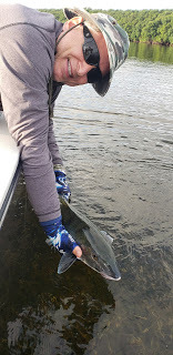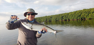 It's Alec's birthday tomorrow and what a better way to spend the day than fishing with him. Every time we fish we have a blast and the laugh are in steady supply. We had a west wind and that caused the west side of the bay outside of the marina in Homestead to be super calm. As we fished for snook, the first spot was slow. I took him to another spot down the shoreline and it was on with tailing tarpon and big bonefish. After numerous shot at a tarpon and not hooking up we turned our attention bonefish and quickly got a nice 9 lber to the boat. The snook fishing was slow and we wrapped it up breaking in his new plug rod but there were no big fish around, probably due to the approaching cold front. Happy birthday Alec!