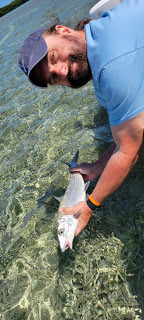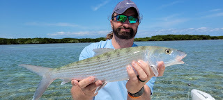 Today was a day that had me confused. I had two amazing men onboard in Chester and Todd and they wanted bonefish and only bonefish. Chester has dreamt of catching bonefish since he was 4 years old and this was certainly a dream fish for him. Off we went to a spot I like under the calm conditions we had and pretty soon Chester gets a bite but the fish is hooked only briefly and just moments later Todd hooks a freight train of a bonefish, out of the same school as Chester's fish. What a few first runs! As the fish tired it got closer to the boat but got under the boat and broke us off as we all stared at him. Ouch, 0-2! The action slowed and I took them to another area. Here we had a big school swim through and the guys hooked a double header but inexplicably they both came off after a long run and deep into the fight. Are you kidding me? But, in the 4th quarter Chester hooked a nice fat bonefish that we got in the boat, got the pic and got Chester's dream come true. Whew, 1 for 5 on bonefish and I don't know if that was good or bad but Chester got his bonefish so I'm ecstatic.