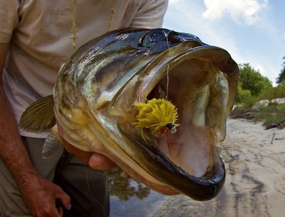 My fishing day was Tuesday. The spot was the Econ. The vessel was a kayak. The method was fly fishing with a deerhair bug. The fishing started off slow, built to a thundering crescendo, and then completely died. The bass were mostly small ones, but I got one pushing four pounds that was blind in one eye (photo below) and an even larger one that I did not get a photo of. The sunfish were aggressive, smacking that big bug. One even managed to impale itself on the #2 hook. It was a beautiful, very enjoyable day. One weird thing, I did not see an alligator. Where were they???