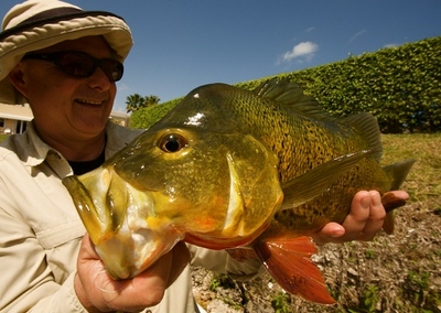 Peacock bass are easy fish to catch. They hold on a spot and won't leave. You keep throwing your bait at them until they get pissed off and bite it. Sometimes that's a cast or two. Sometimes it's 20 minutes. But unless they break you off you're usually going to get any fish you bother to throw to. One of the successful flies was Yank's Redfish Assassin. Yank, I know you'll like seeing that!