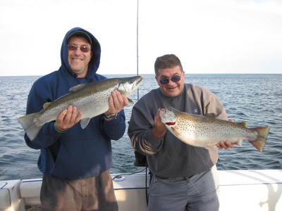 Brown trout fishing out of Oswego was very productive. It wasn't the silly fishing we had last week but, if you work for them you will do fine. With the heavy South winds we had over night the shore line was very clear this am. Flatline's off planer boards 110-140' back and riggers set 3-5' down produced the best. This led to more natural baits taking over, blk/silver smithwicks, tuxedo,alewife, carmel dolphin and green dolphin Stingers.